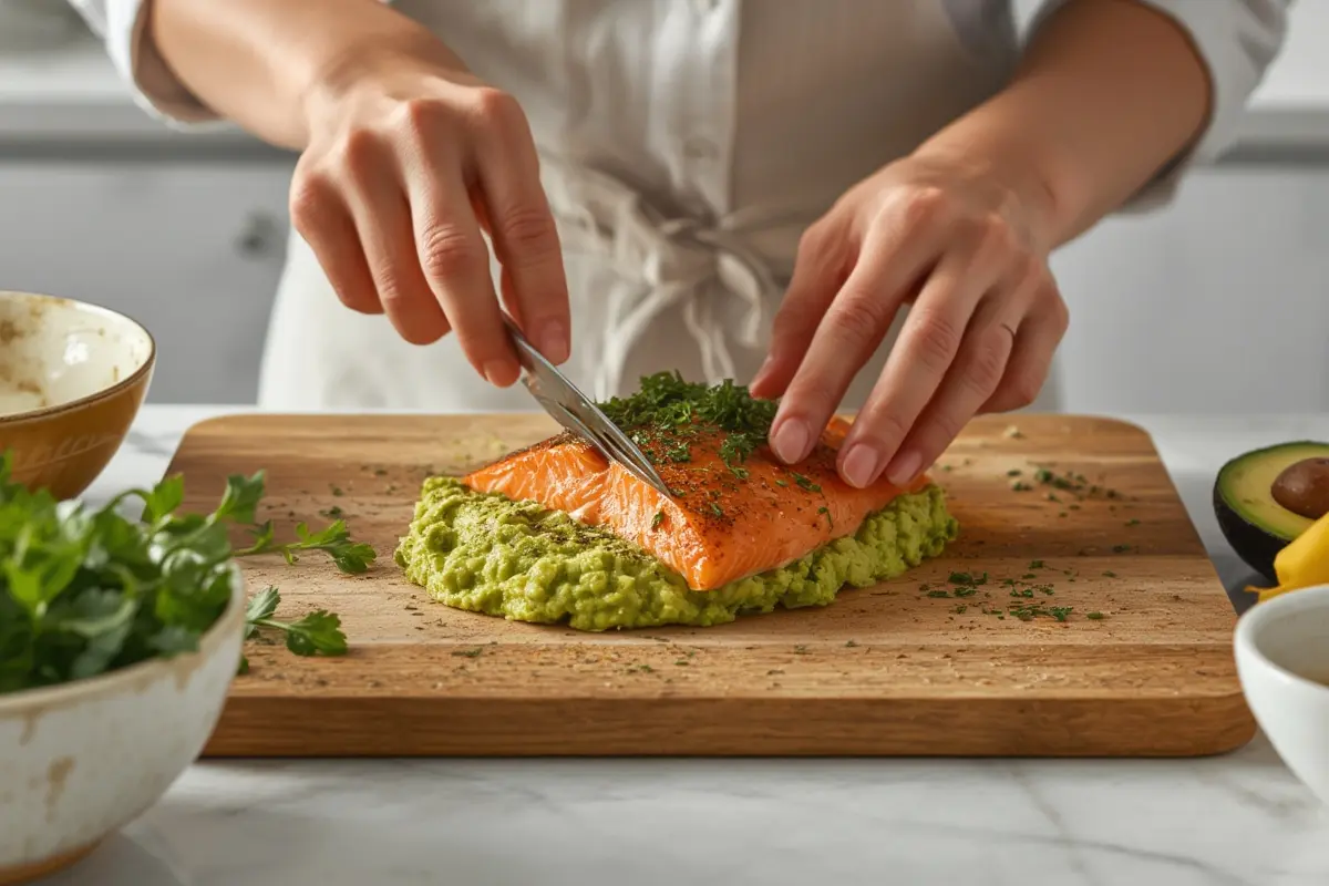 - Once the salmon is ready, remove it from the oven and serve immediately with a generous dollop of the fresh avocado mash.