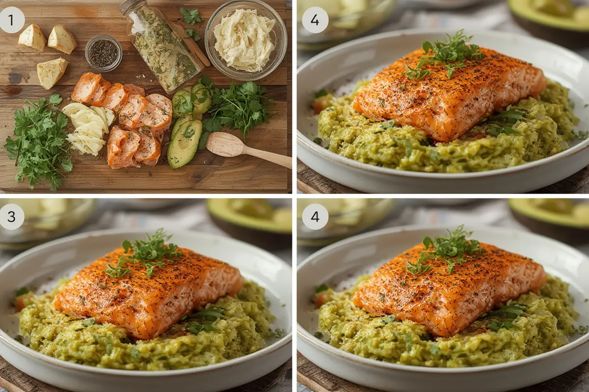 Learn how to make a delicious baked salmon with creamy avocado mash in just 5 simple steps!
