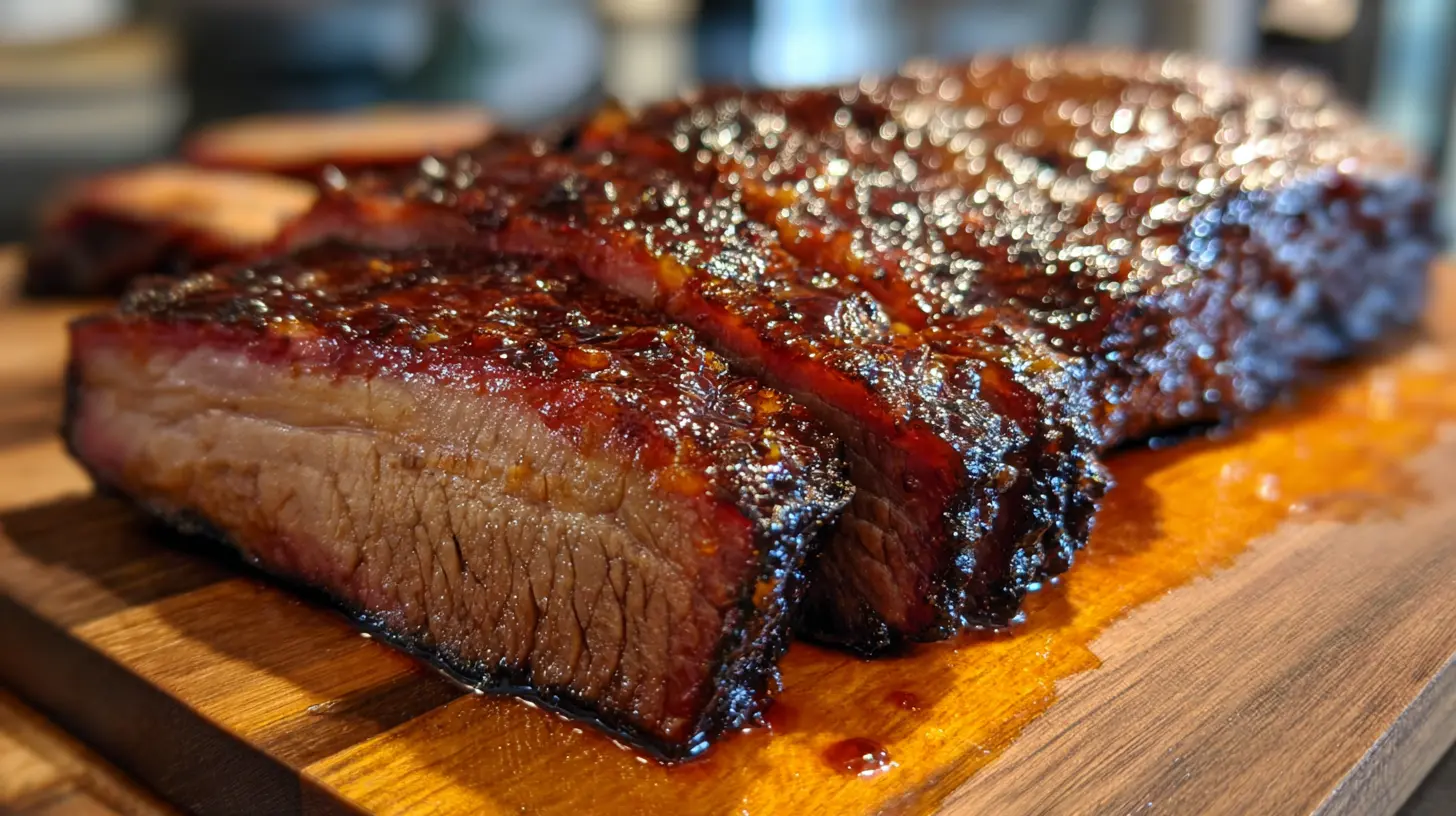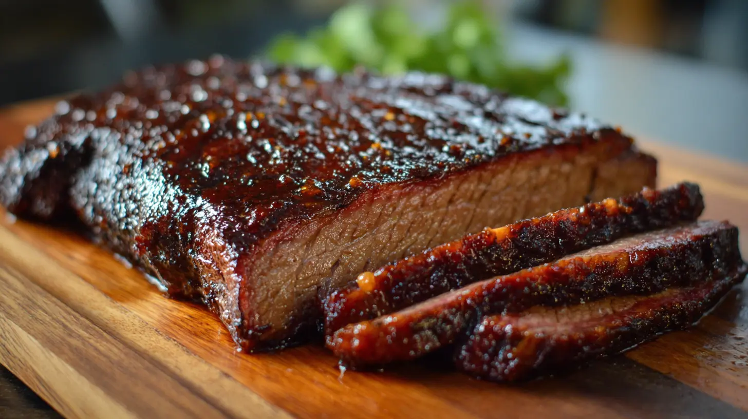 Close-up of a perfectly smoked BBQ brisket with a deep red smoke ring and bark