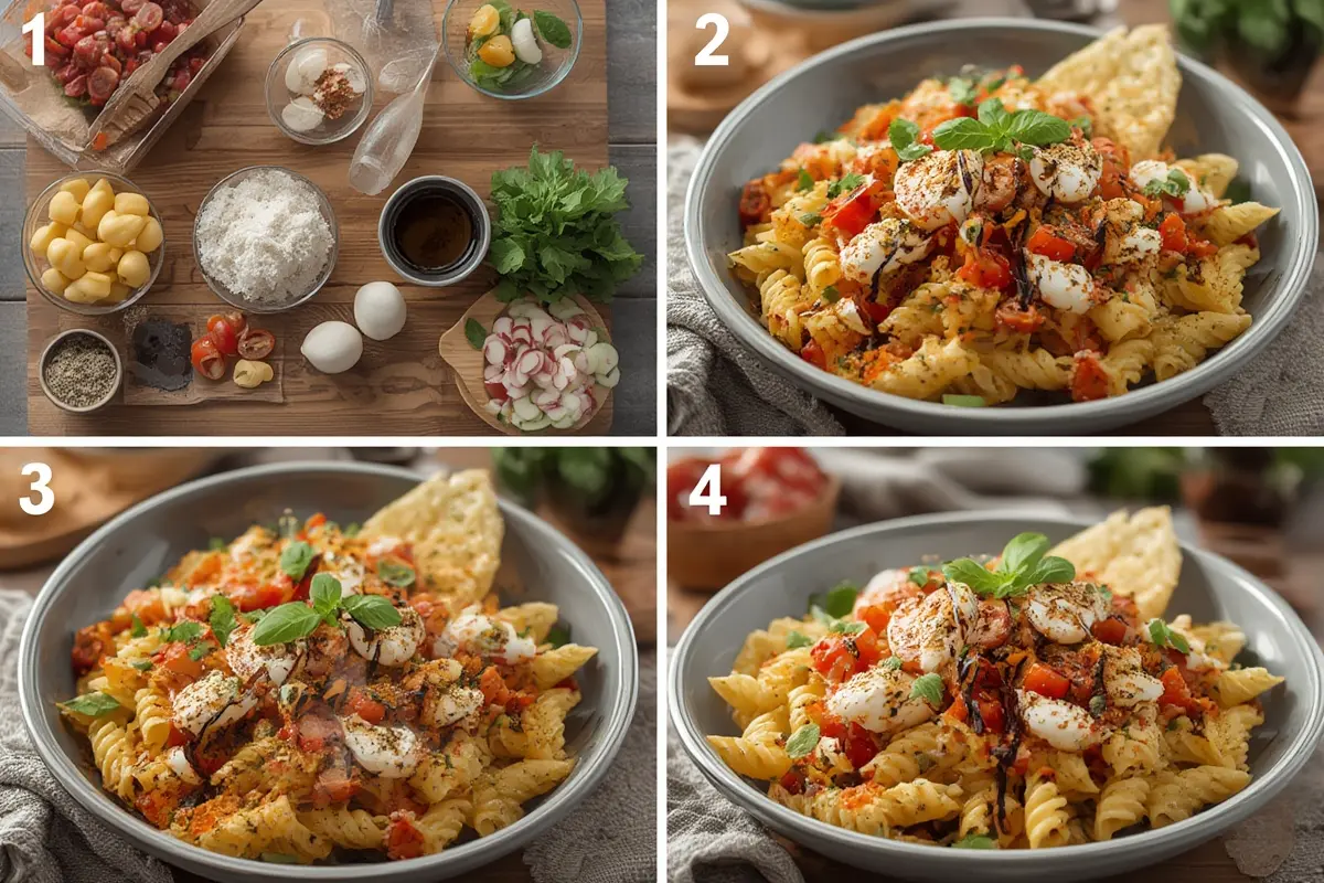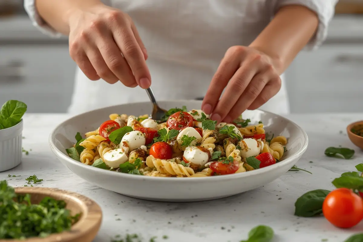 3. Combine ingredients: In a large bowl, add cooled pasta, halved tomatoes, mozzarella pearls, and torn basil leaves.