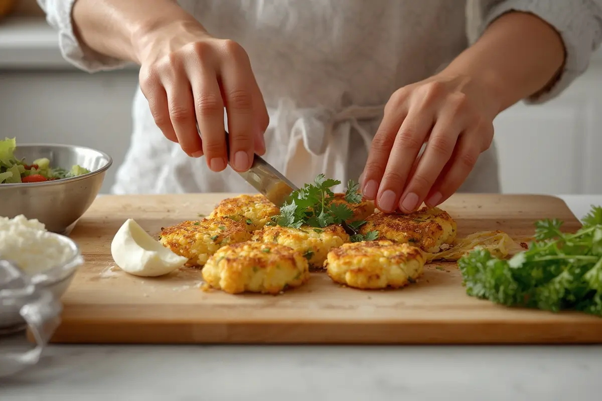 Crispy golden cauliflower hash browns, ready to serve