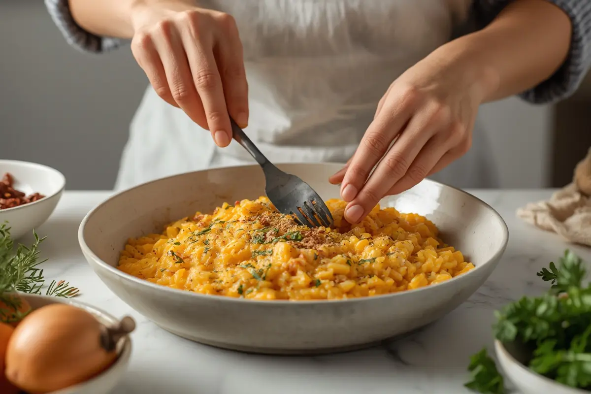 - Remove the risotto from the heat, let it sit for a few minutes, and then serve immediately, garnished with extra Parmesan if desired.