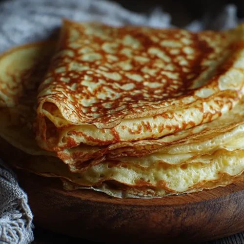 6. Stack and Keep Warm: Transfer finished crepes to a plate, stacking them on top of each other. Cover with a clean kitchen towel to keep warm while you cook the remaining batter.