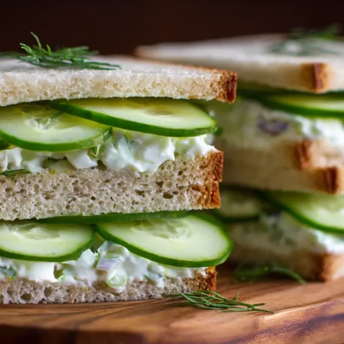 Cucumbers are over 95% water, making these sandwiches naturally hydrating. They’re also low in calories yet rich in vitamins K, B, and C, as well as minerals like copper, phosphorus, and potassium. The cream cheese provides calcium and protein, while the fresh herbs add antioxidants and micronutrients. Using whole grain bread can increase the fiber content, making these sandwiches more satiating despite their light profile.