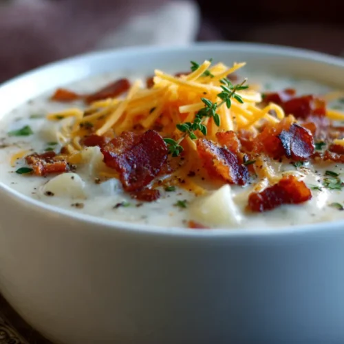7. Serve: Ladle the soup into bowls and top with shredded cheddar cheese, crumbled bacon, green onions, and a dollop of sour cream if desired.