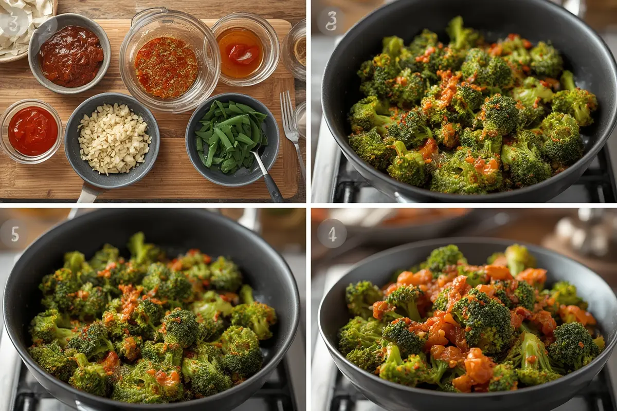 5. Add the sauce: Pour the Spicy Gochujang Broccoli sauce over the florets and toss quickly to coat evenly. Continue cooking for 2-3 minutes until the sauce thickens slightly and glazes the broccoli.