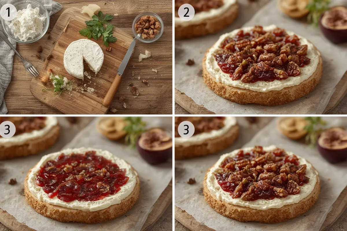 This spread can be prepared up to 3 days in advance and stored in an airtight container in the refrigerator. The assembled dish (with jam and nuts) keeps well for up to 24 hours covered with plastic wrap.