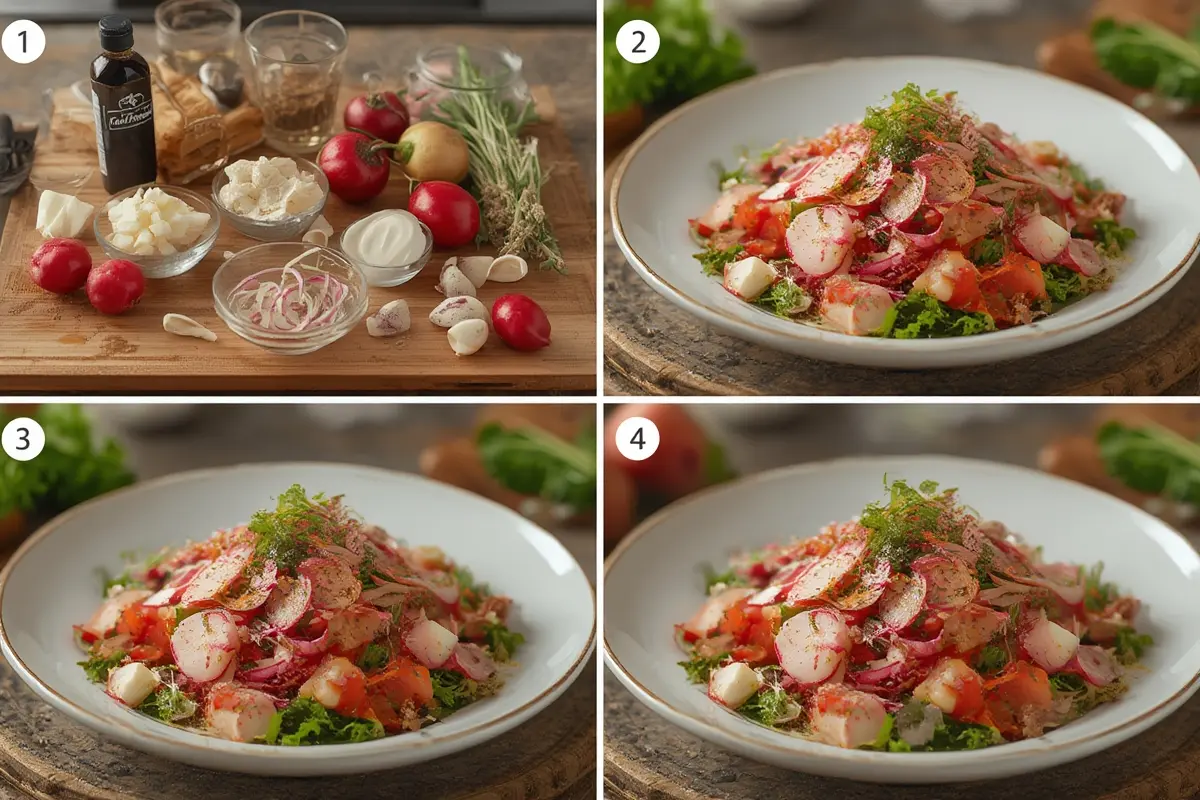 6. Plate: Arrange on a serving platter, ensuring the colorful radishes are visible. Drizzle any remaining dressing over the top.