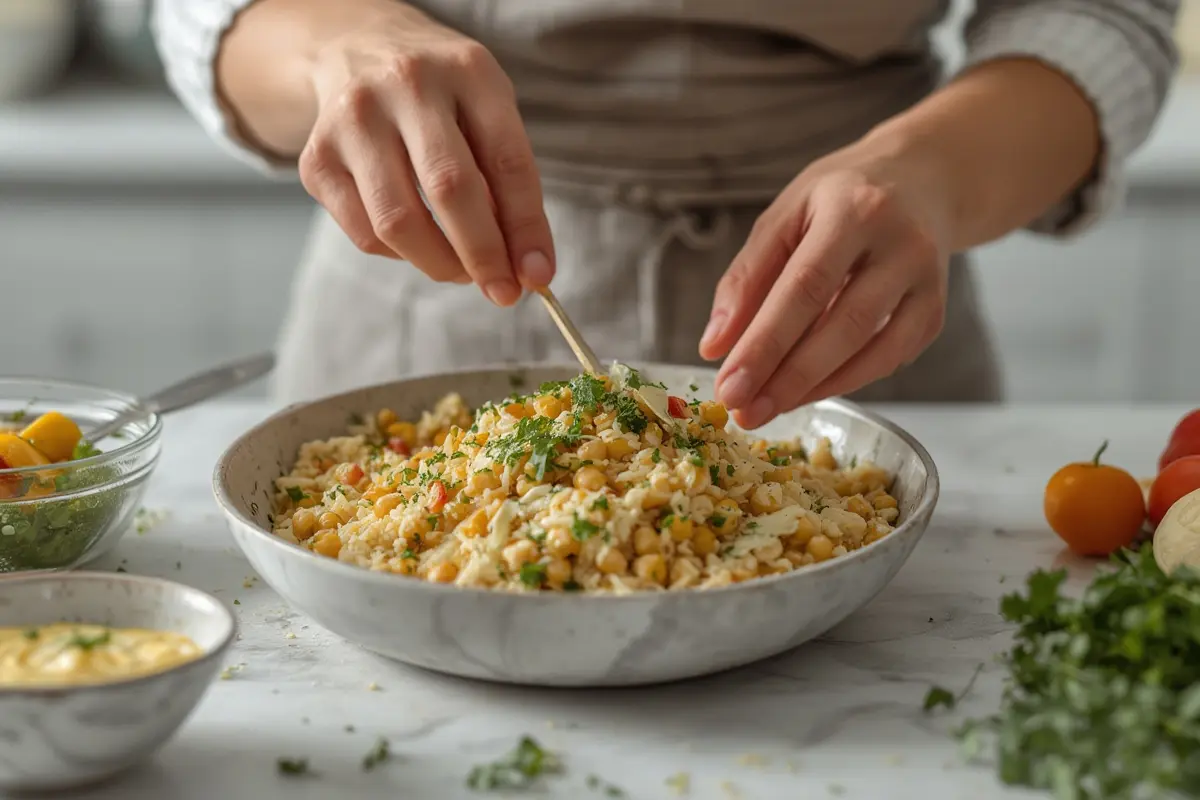 - Pour the lemon-tahini dressing over the chickpea and rice mixture. Toss gently to ensure everything is evenly coated.