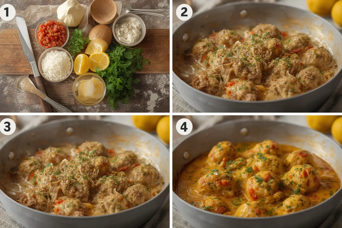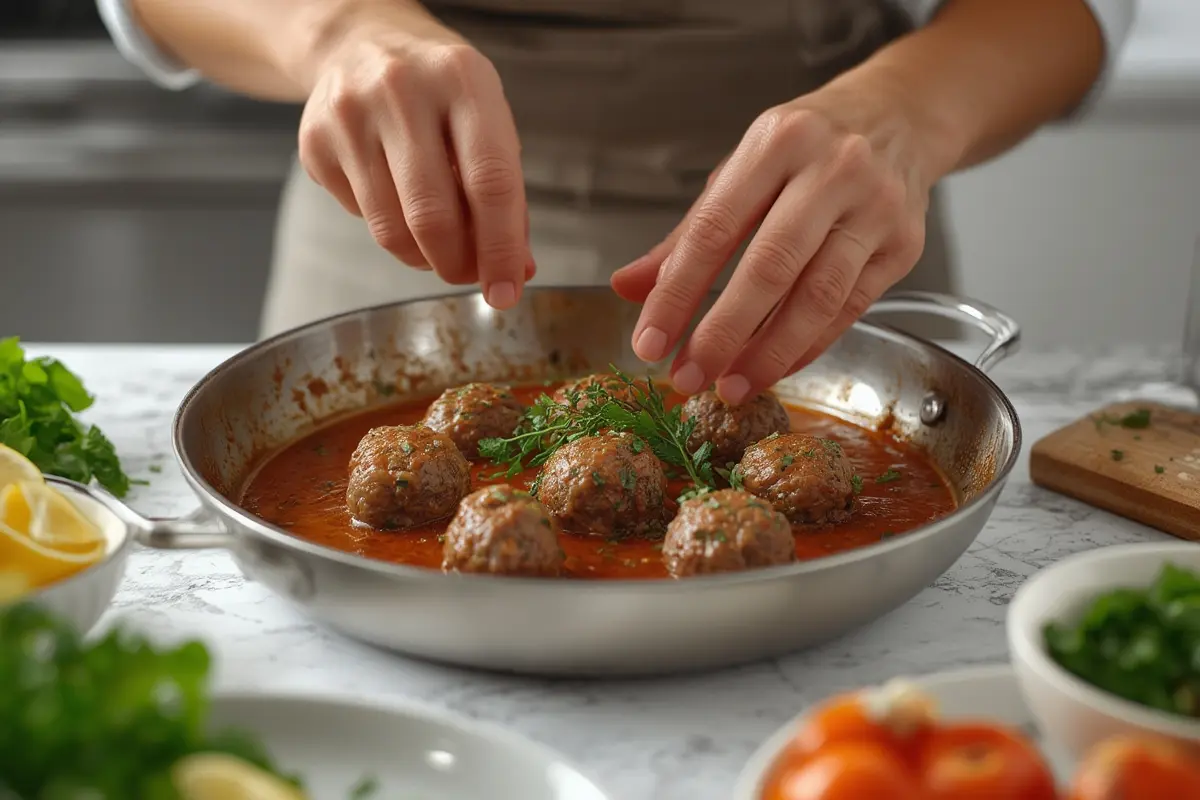 - Once meatballs are cooked, pour the lemon sauce mixture into the skillet with the meatballs. Stir gently to coat and bring to a simmer.
