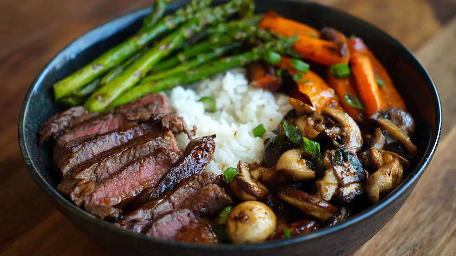Each bowl provides approximately 450-550 calories, with balanced macronutrients including 30-35g protein from the steak, complex carbohydrates from the rice, and essential vitamins and minerals from the vegetables. The ginger offers anti-inflammatory benefits, while the protein-rich steak supports muscle maintenance and repair. For a lower-carb option, substitute cauliflower rice.
