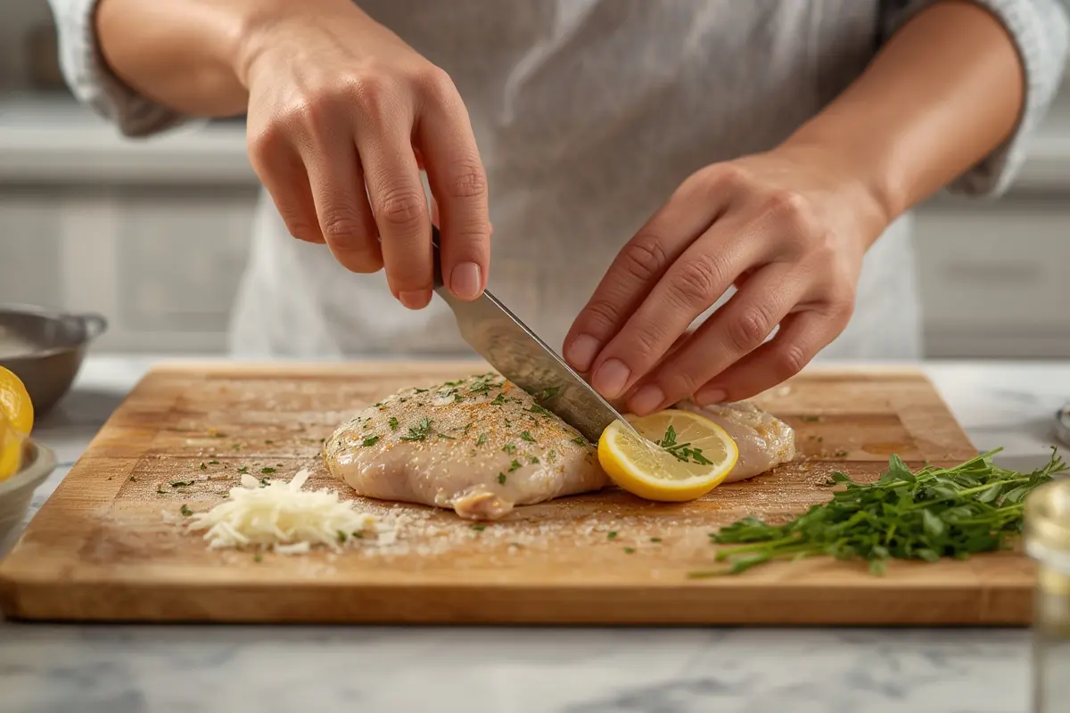 1. Prepare the chicken: Place chicken breasts between two sheets of plastic wrap and pound to an even 1/2-inch thickness. Season both sides generously with salt and pepper.