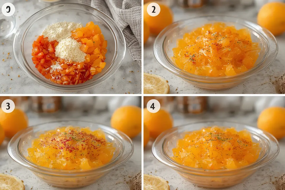 1. Dissolve the gelatin: In a large mixing bowl, dissolve the orange gelatin in 2 cups of boiling water. Stir continuously for about 2 minutes until completely dissolved.