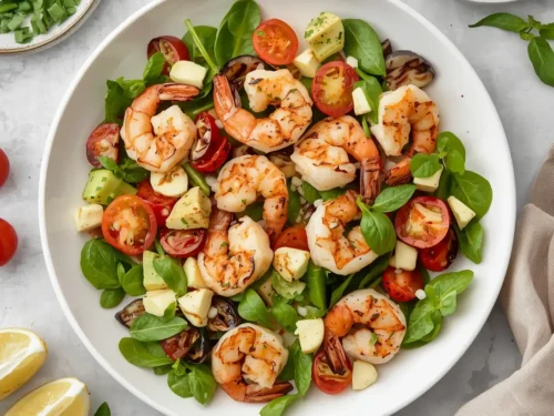 Refrigeration – Store the salad in an airtight container, keeping the vinaigrette separate if you plan to eat it later. It stays fresh 2–3 days. – Shrimp – If you must store cooked shrimp, keep them in a shallow dish covered with plastic wrap; they retain texture best when not over‑marinated. – Freezing – The grilled shrimp can be frozen on a tray (single layer) for up to 2 months. Thaw in the fridge overnight, then re‑heat lightly on a skillet before adding to fresh veggies. – Reheat – Shrimp should be warmed gently; use a quick sauté over medium heat for 1‑2 minutes. Avoid microwaving, which makes the shrimp rubbery. – Food safety – Never leave the salad at room temperature for more than 2 hours. Keep the shrimp chilled below 40 °F (4 °C) before serving.
