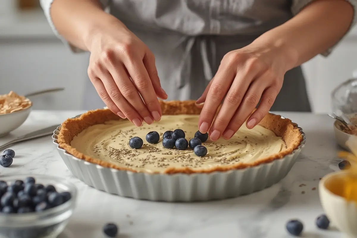 6. Add fresh berries: Scatter the remaining cup of fresh blueberries on top of the filling, gently pressing them in.