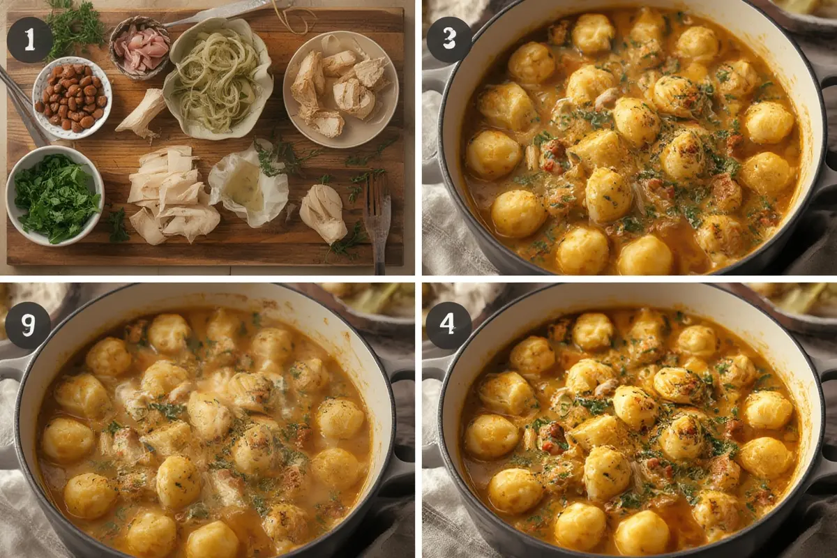 • Pour in the chicken broth, bringing it to a simmer, then stir in shredded chicken, heavy cream, and seasonings.