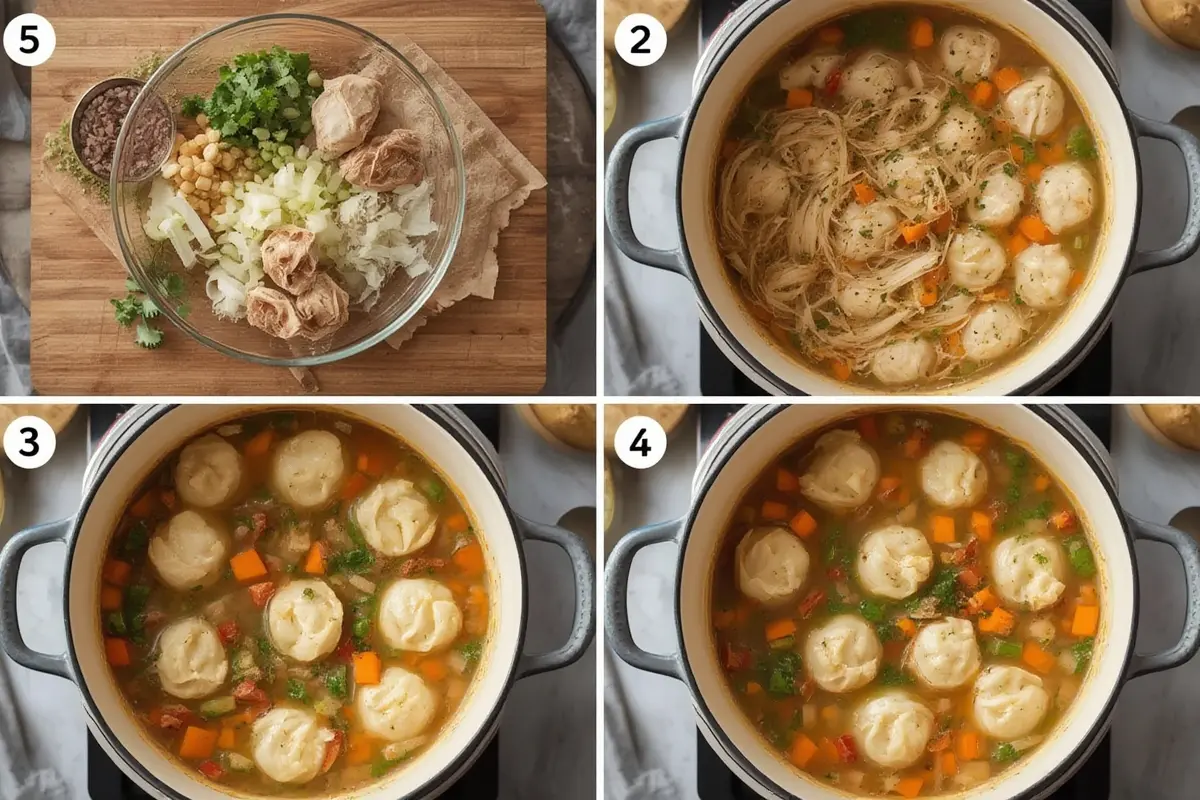 - Drop spoonfuls of dumpling dough into the simmering soup. Cover and cook for an additional 10 minutes, or until the dumplings are puffed and cooked through.