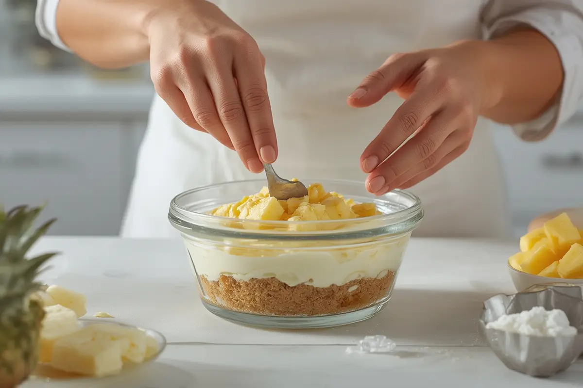 6. Assemble the dessert: Spread half the cream mixture over the chilled crust. Distribute the drained pineapple evenly over this layer. Top with remaining cream mixture, creating a smooth surface.