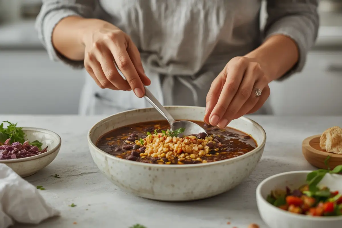 A bowl of protein-packed black bean and lentil soup, rich in color and texture.