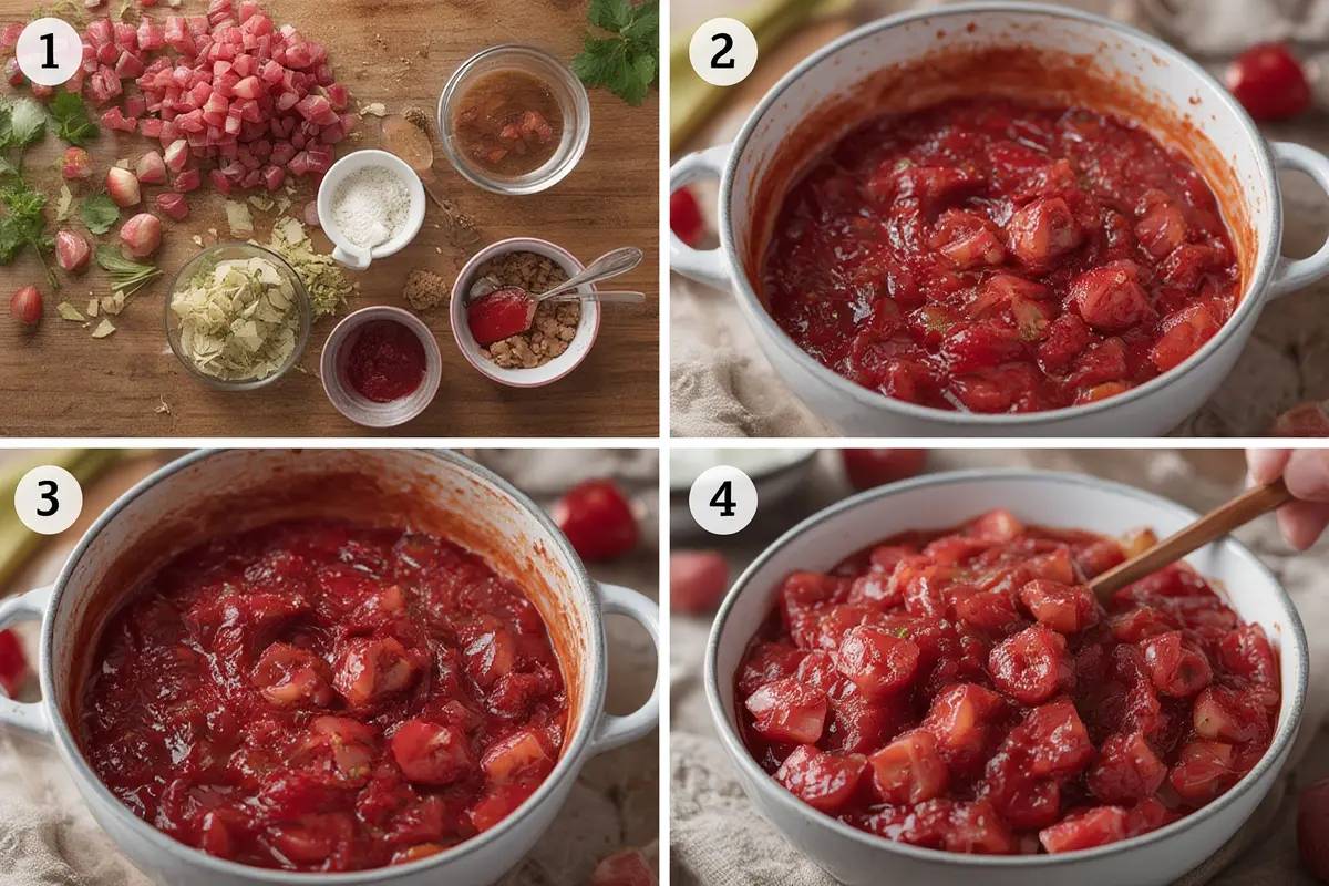 • In a large non-reactive pot, combine the chopped rhubarb, granulated sugar, and lemon juice. Stir well to coat the rhubarb with sugar.