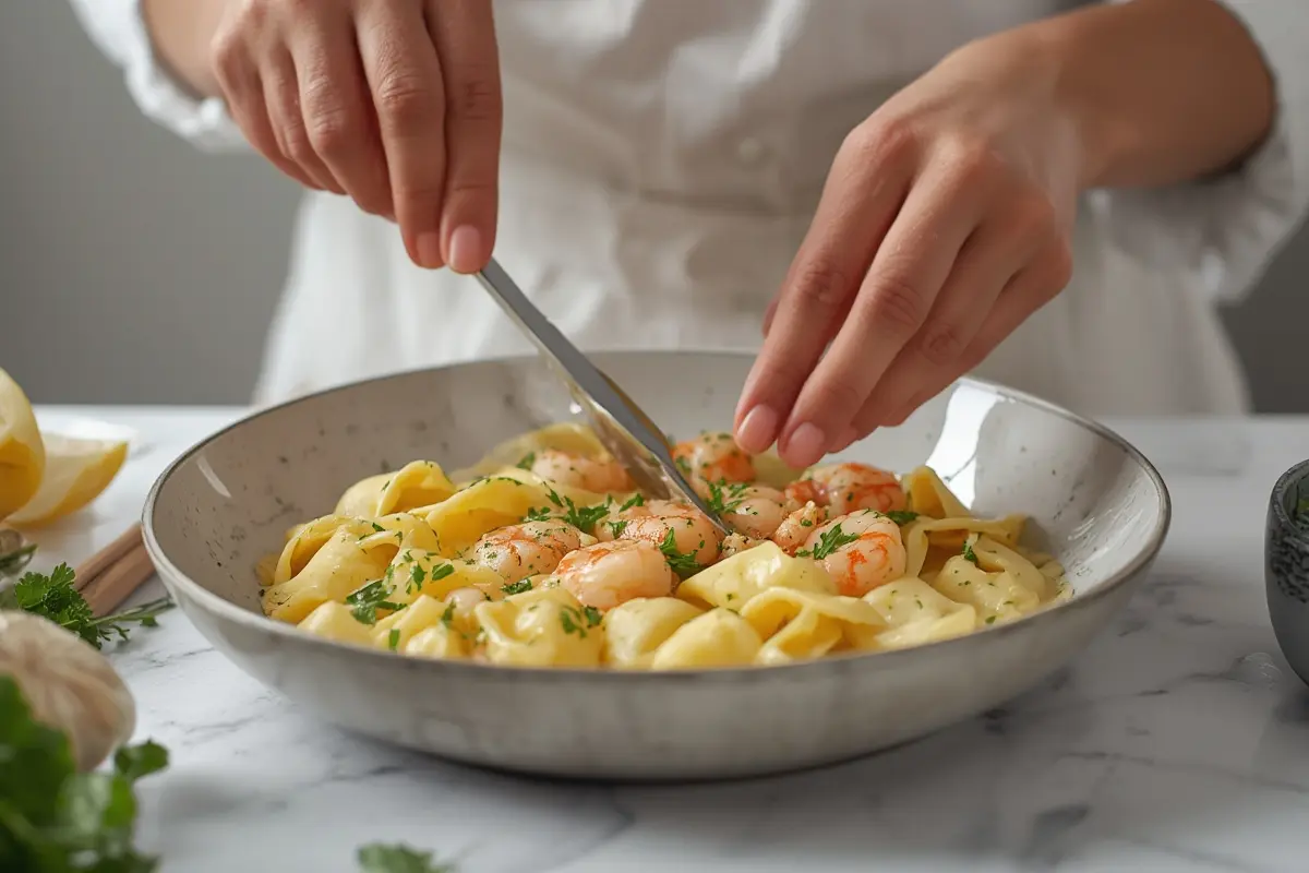 4. Develop the flavors: Add heavy cream, lemon juice, and lemon zest. Bring to a gentle simmer (do not boil) and cook for 3-4 minutes until slightly thickened. The Shrimp Tortellini in Lemon Garlic Cream Sauce gets its signature flavor from this crucial step, similar to how Lemon Garlic Shrimp Pasta derives its bright profile.