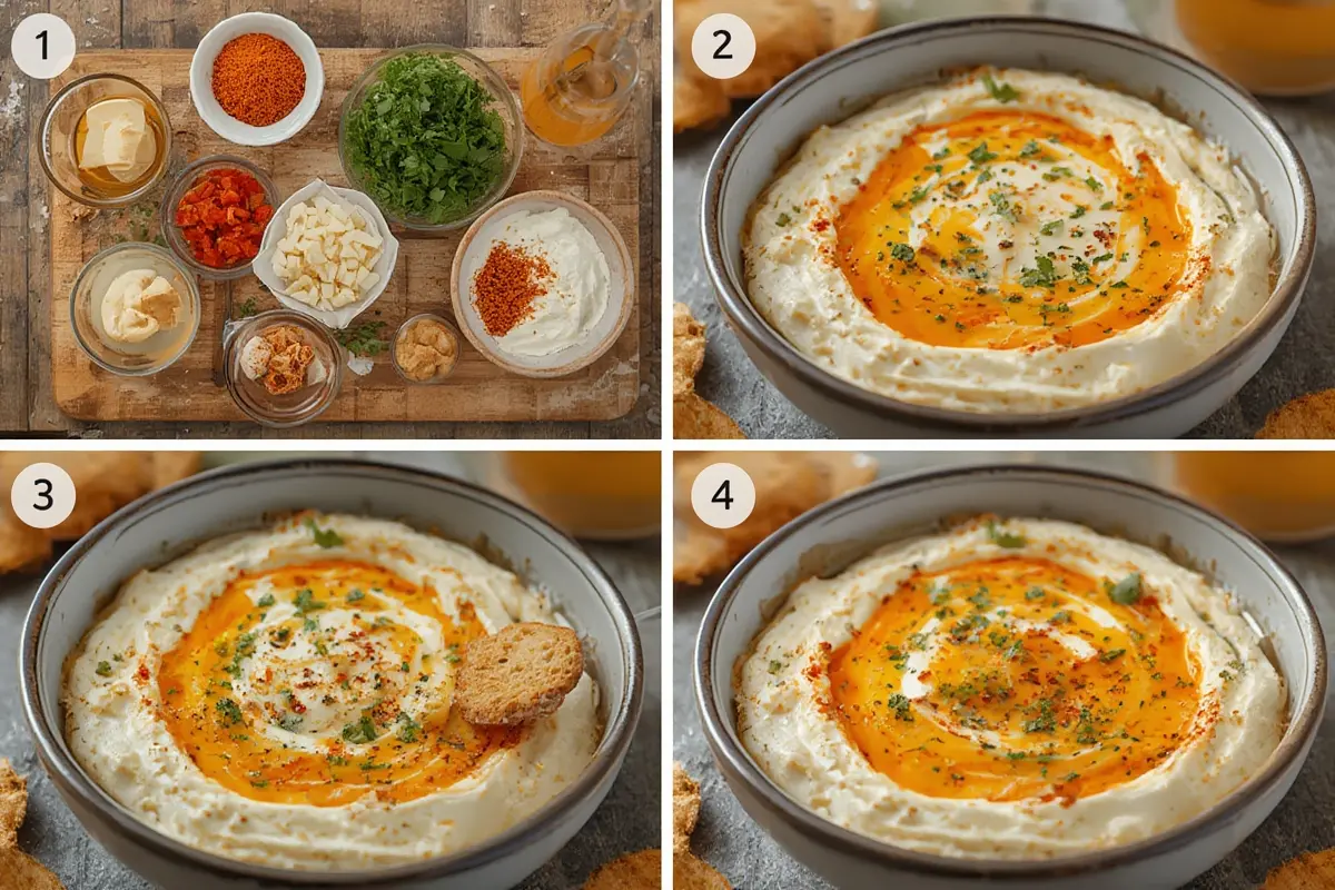 4. Assemble the dip: Transfer the ricotta mixture to a serving bowl. Create a shallow well in the center with the back of a spoon. This Spicy Ricotta Dip with Hot Honey presentation allows for optimal flavor distribution when the Hot Honey Dips into the creamy base.