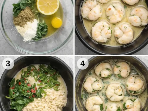 - Cook the filling – Sauté shrimp, garlic, and spinach, then fold in cream cheese, parmesan, and seasonings.