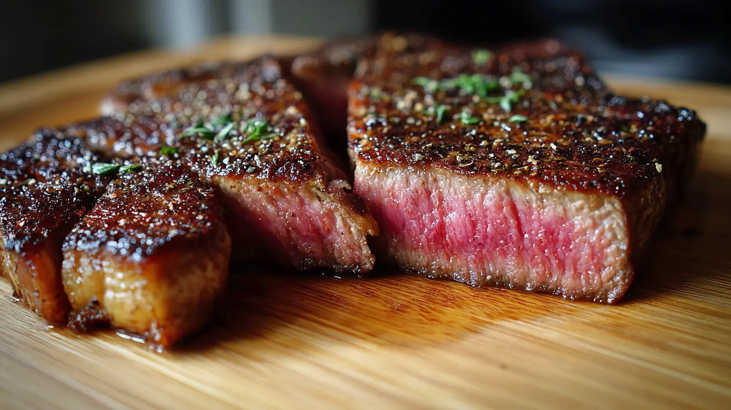 A perfectly cooked pan-seared ribeye steak with a golden-brown crust