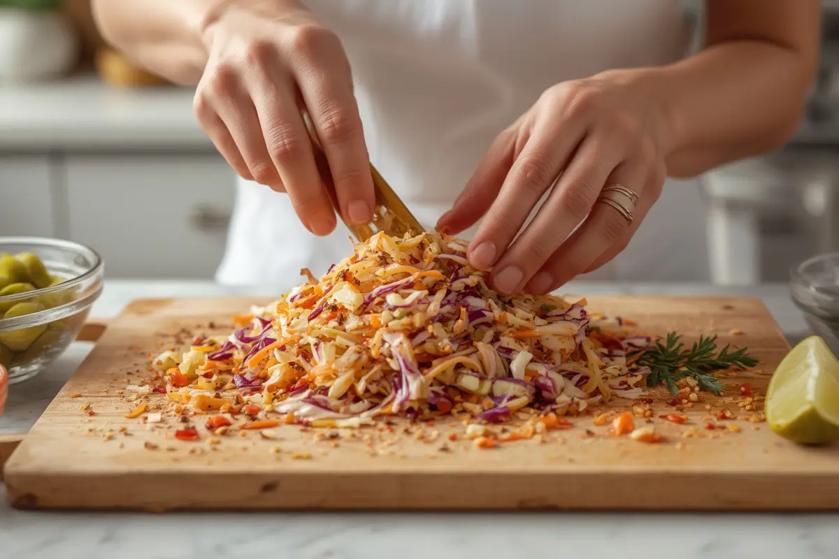 This slaw isn’t just delicious—it’s nutritious too. Cabbage is rich in vitamin C and fiber, supporting immune function and digestive health. Carrots provide beta-carotene for eye health, while the fermented pickles offer probiotic benefits. The apple cider vinegar may help regulate blood sugar levels, and the minimal added sugar makes this a healthier alternative to traditional coleslaw recipes.