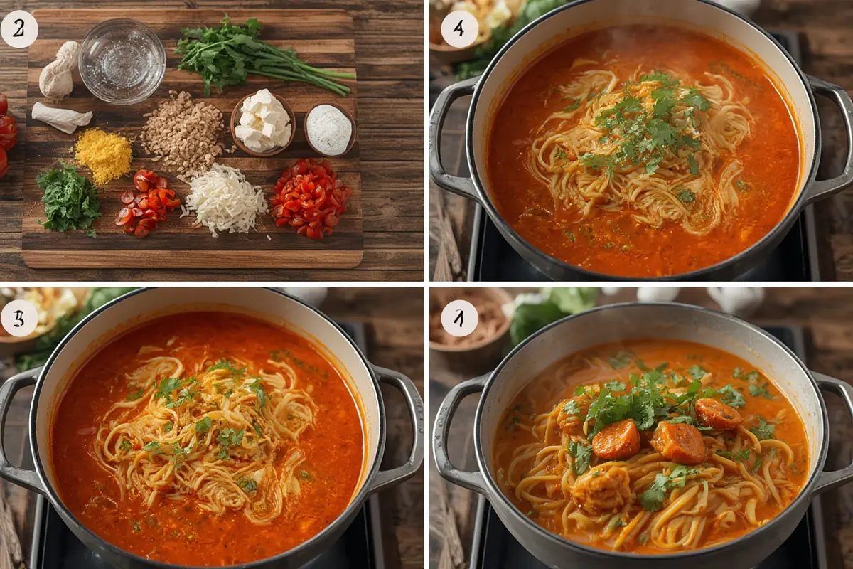 8. Final assembly: Add pre-soaked noodles to the pot and simmer for 1-2 minutes until heated through.