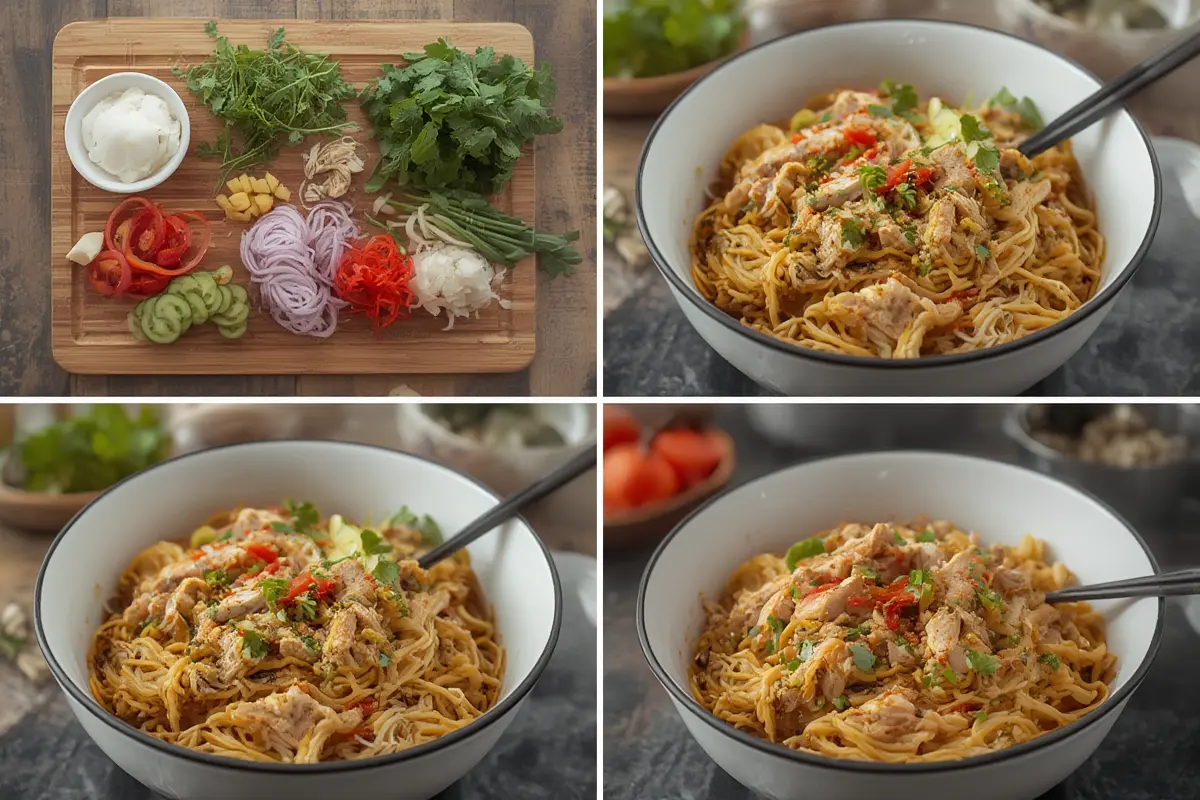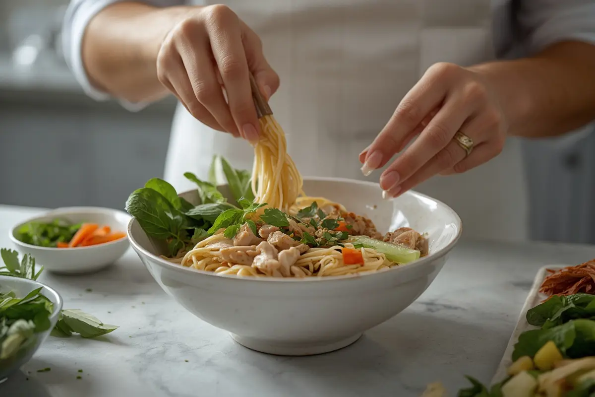 5. Assemble bowls: Place a portion of noodles in each bowl, arrange sliced chicken and vegetables artfully around the noodles. For authentic Bun Ga, ensure ingredients are grouped rather than mixed.